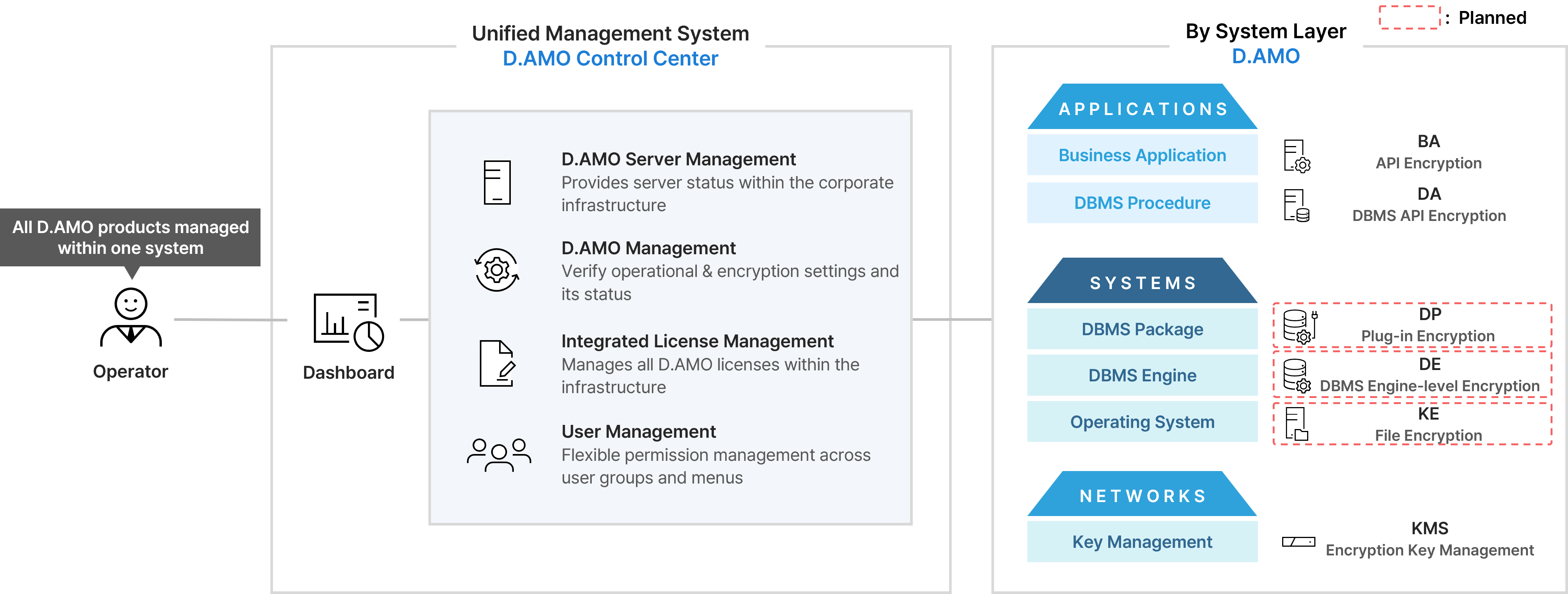 The more your infrastructure expands and diversifies, the harder it becomes to manage security systems, from identifying failures to controlling access. D.AMO Control Center provides centralized management for all D.AMO products from a single system. It monitors servers to deliver real-time installation and status information, verifies encryption configurations, and confirms proper operations. Through detailed access controls and separated encryption/decryption permissions, it builds a secure management environment you can trust.